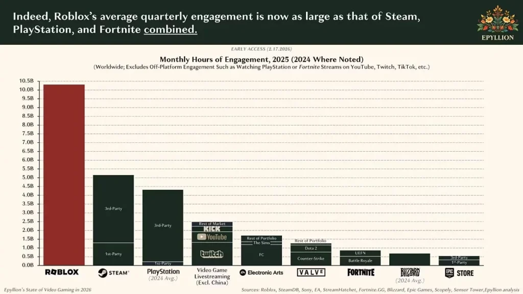 As estatísticas do Roblox em relação ao número de horas jogadas se destacam notavelmente em comparação com o Steam, onde são registradas 5,1 bilhões de horas, e o PlayStation, com suas 4,3 bilhões de horas. De acordo com o analista Matthew Ball, o Fortnite, assim como plataformas de jogos como a Epic Games Store, ainda estão muito atrás.