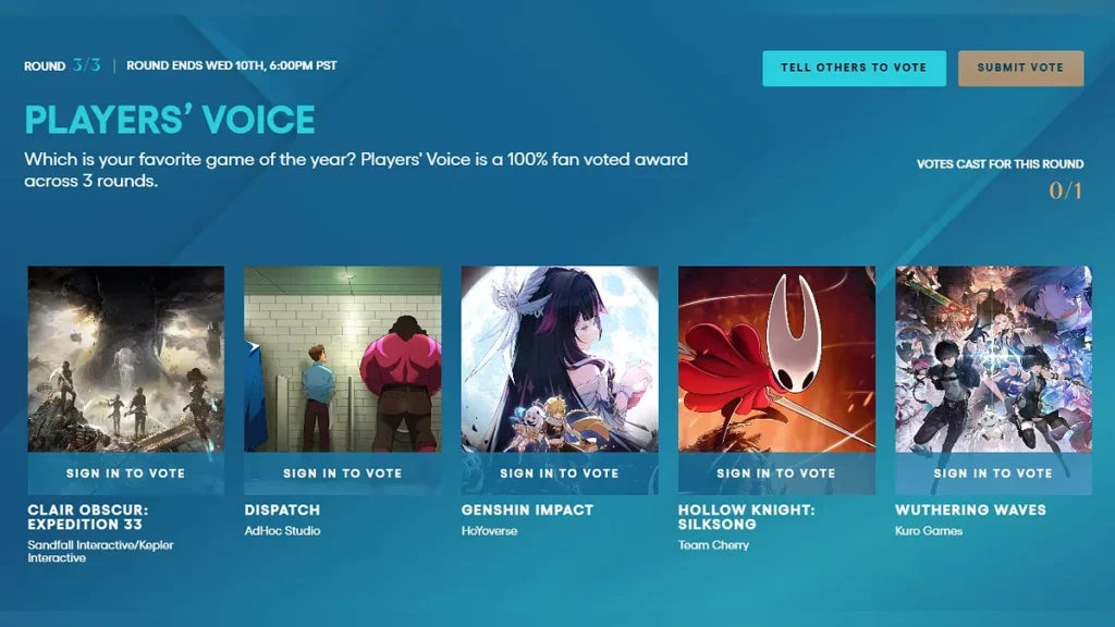 Após a segunda fase, vários títulos foram eliminados da votação dos fãs, incluindo os jogos de ação e aventura Death Stranding 2: On The Beach e Ghost of Yotei, o jogo de plataforma 3D Donkey Kong Bananza, o roguelike de ação Hades 2 e o RPG medieval Kingdom Come: Deliverance 2.