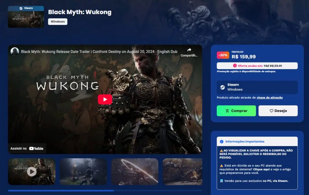 Este é o menor valor já oferecido para o game no momento, e ao realizar a compra, você receberá um código e poderá ativar Black Myth: Wukong em sua conta Steam de maneira permanente.