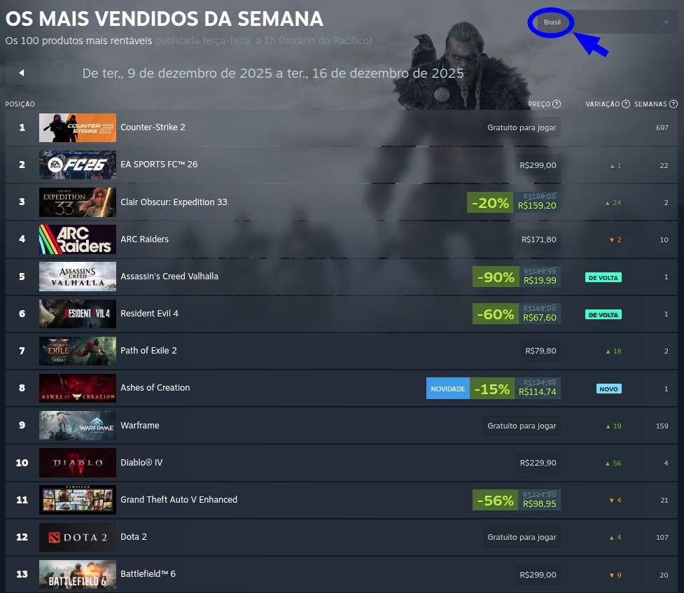 A Valve divulgou seu mais recente ranking de vendas do Steam para o período de 9 a 16 de dezembro de 2025. A lista completa, incluindo jogos gratuitos, está disponível neste link.