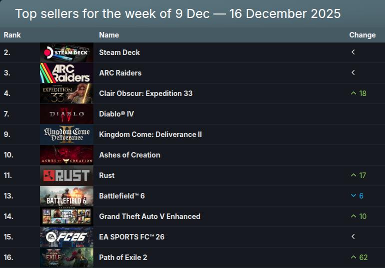 ARC Raiders ficou em primeiro lugar, mantendo-se como um dos maiores sucessos de dezembro. O segundo lugar ficou com GOTY de 2025, Clair Obscur: Expedition 33. Seu rápido crescimento de vendas está diretamente ligado ao seu retumbante sucesso no The Game Awards, onde o jogo atraiu um público amplo.