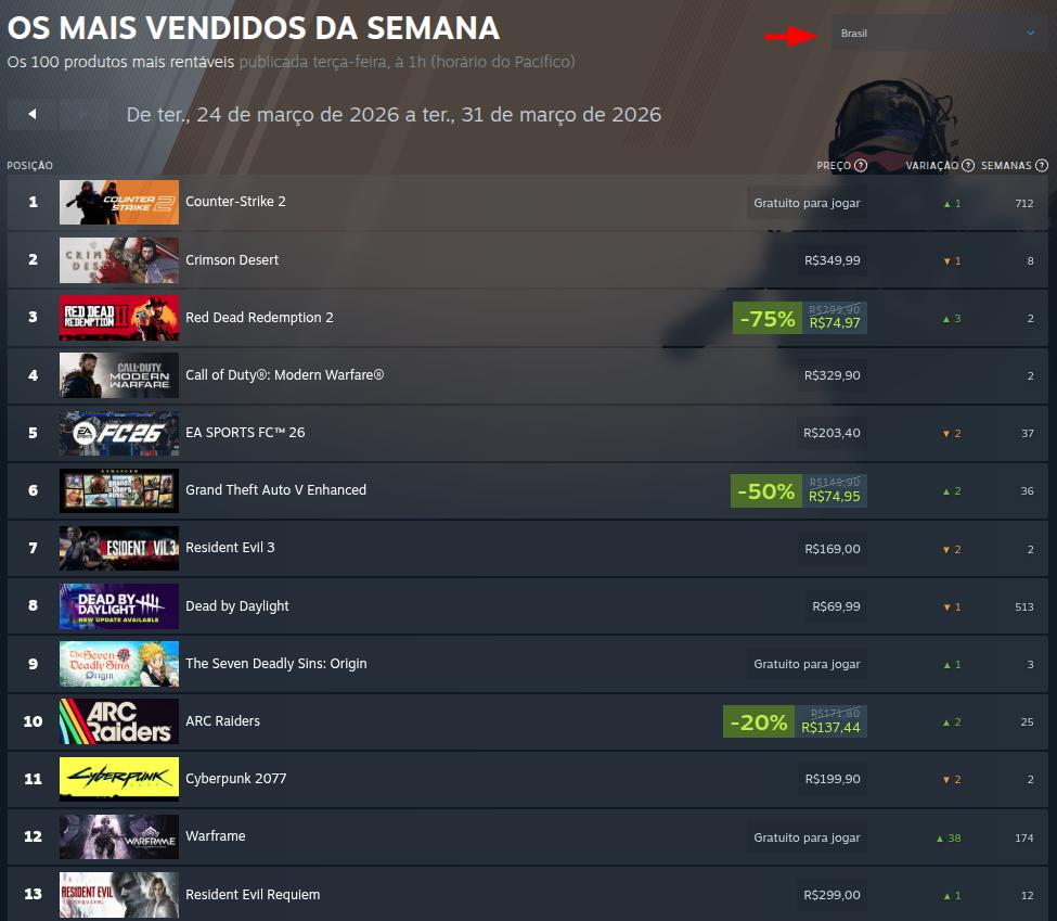 A Valve divulgou seu mais recente ranking de vendas do Steam para o período de 24 a 31 de março de 2026. A lista completa, incluindo jogos gratuitos, está disponível neste link.