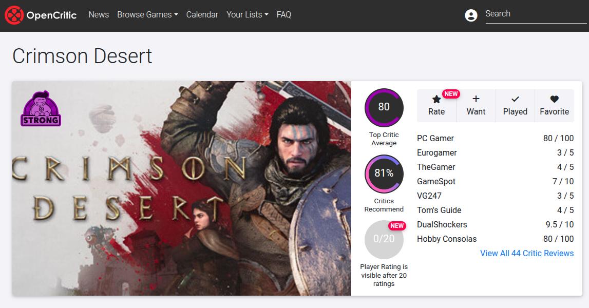 Um crítico da Eurogamer comparou Crimson Desert a um “Candy Crush de prestígio”. O jogo era “tecnicamente perfeito” e tinha um combate excelente, mas os personagens da história eram “fatalmente” superficiais. O mundo aberto também carece da “originalidade” de, por exemplo, The Witcher 3 — os belos cenários são meramente decorativos.