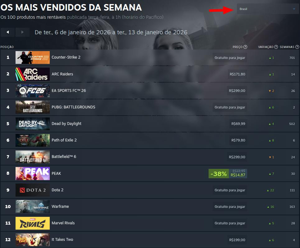 Entre os mais vendidos da semana no Brasil, ARC Raiders também liderou o ranking. Logo na sequência vemos o simulador de futebol EA Sports FC 26 e o survival horror multiplayer Dead by Daylight para fechar o pódio.