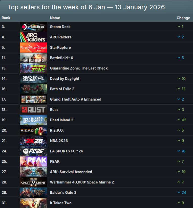 O PC portátil da Valve, Steam Deck, liderou o ranking da semana passada, entre os mais rentáveis. Mas considerando apenas jogos, a medalha de ouro ficou com o jogo de tiro e extração, ARC Raiders, que recentemente teve vendas impressionantes e recebeu uma nova atualização. Logo na sequência, vemos o lançamento mais recente, o jogo de sobrevivência StarRupture.