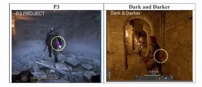 O processo da Nexon também inclui imagens de P3 e Dark and Darker, com a Nexon alegando que Ironmace copiou ações do jogo, como personagens “[movendo] suas mãos em um movimento circular distinto sobre baús sem tocar fisicamente o baú” para abrir os referidos baús“.