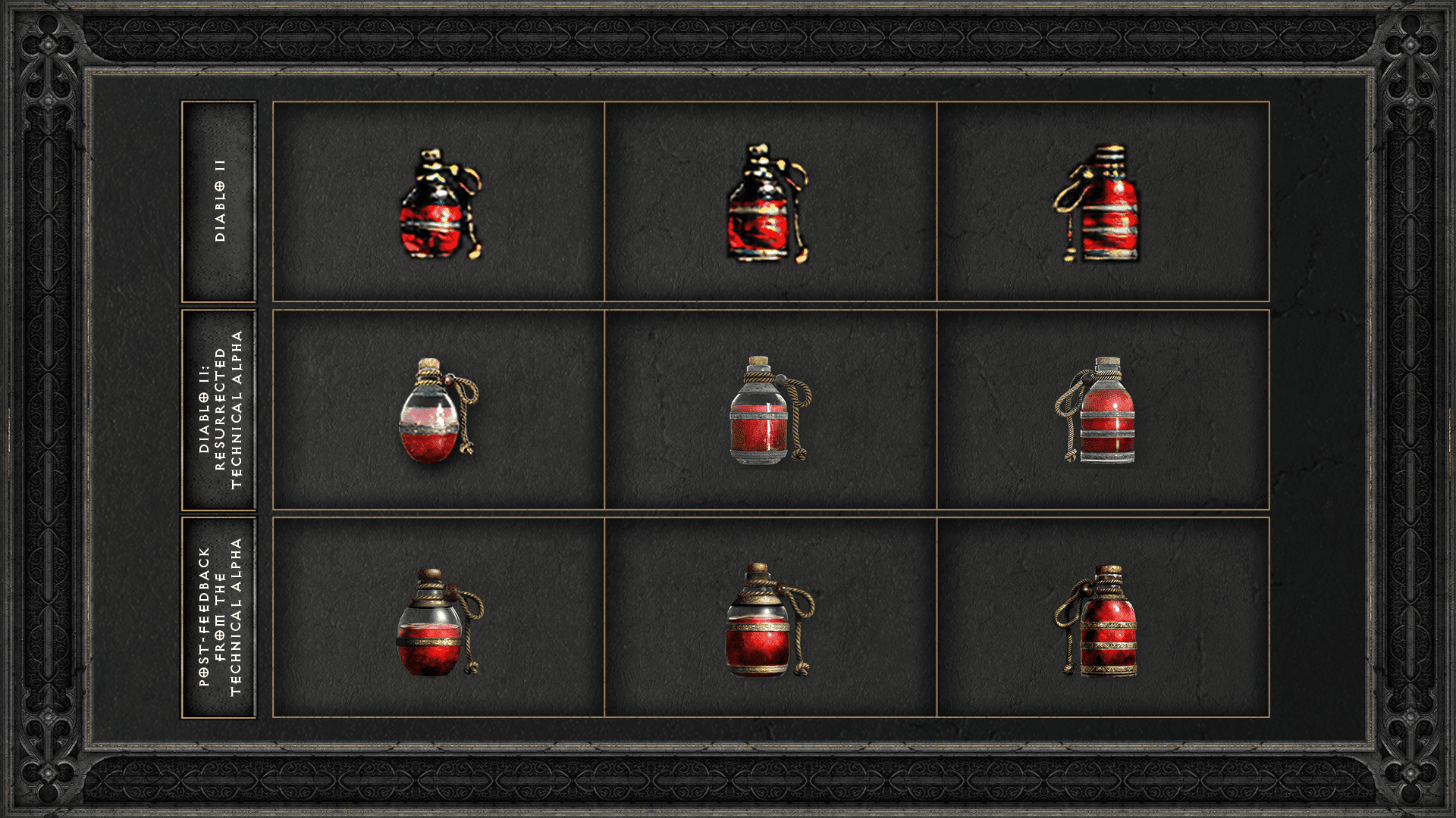 Alguns itens como vocês podem ver nas imagens abaixo, receberam atualizações no seu design, como por exemplo as poções de cura e também itens especiais para melhoria de equipamentos, onde a Blizzard fez um “comparativo” entre a versão Clássica do Diablo 2, a versão que esteve presente durante o Alfa em Abril, e por fim a versão atual do jogo após o feedback dos jogadores.