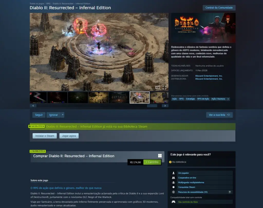 Diablo II: Resurrected – Infernal Edition inclui a remasterização aclamada pela crítica de Diablo II e a sua expansão Lord of Destruction, juntamente com o novíssimo DLC Reign of the Warlock. O game completo custa R$ 174,90.