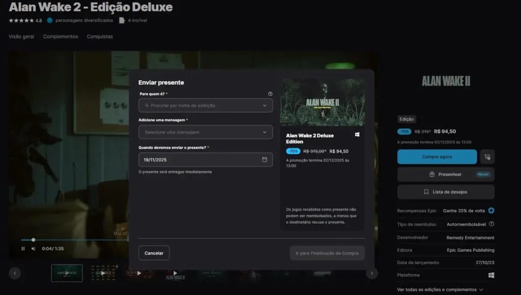 O sistema de presentes da Epic está disponível oferece jogos pagos, edições, complementos duráveis e pacotes elegíveis. Não são elegíveis os seguintes: