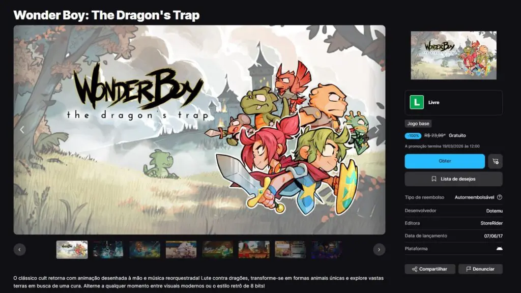 Nesta semana todos podem resgatar de graça o jogo Wonder Boy: The Dragon’s Trap na loja da Epic Games para Mobile.