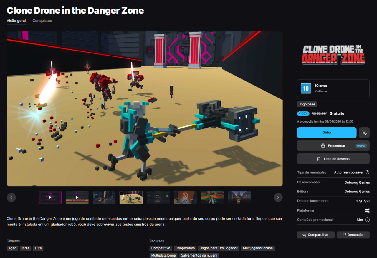 Até 9 de Abril todos podem resgatar de graça o jogo Clone Drone in the Danger Zone na loja da Epic Games para PC.