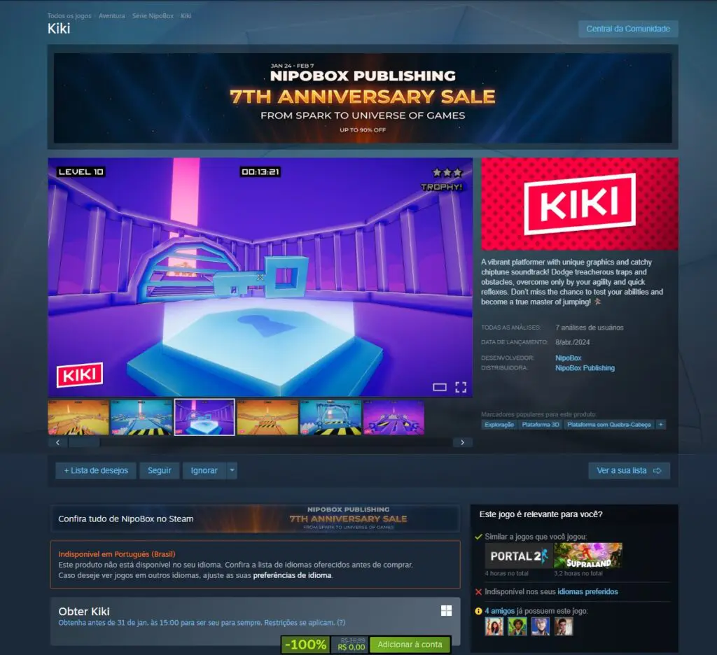 Antes de virar grátis Kiki custava R$ 16,99 no Steam, porém, você precisa resgatar esse jogo até 31 de janeiro, as 15h para ficar com ele para sempre.