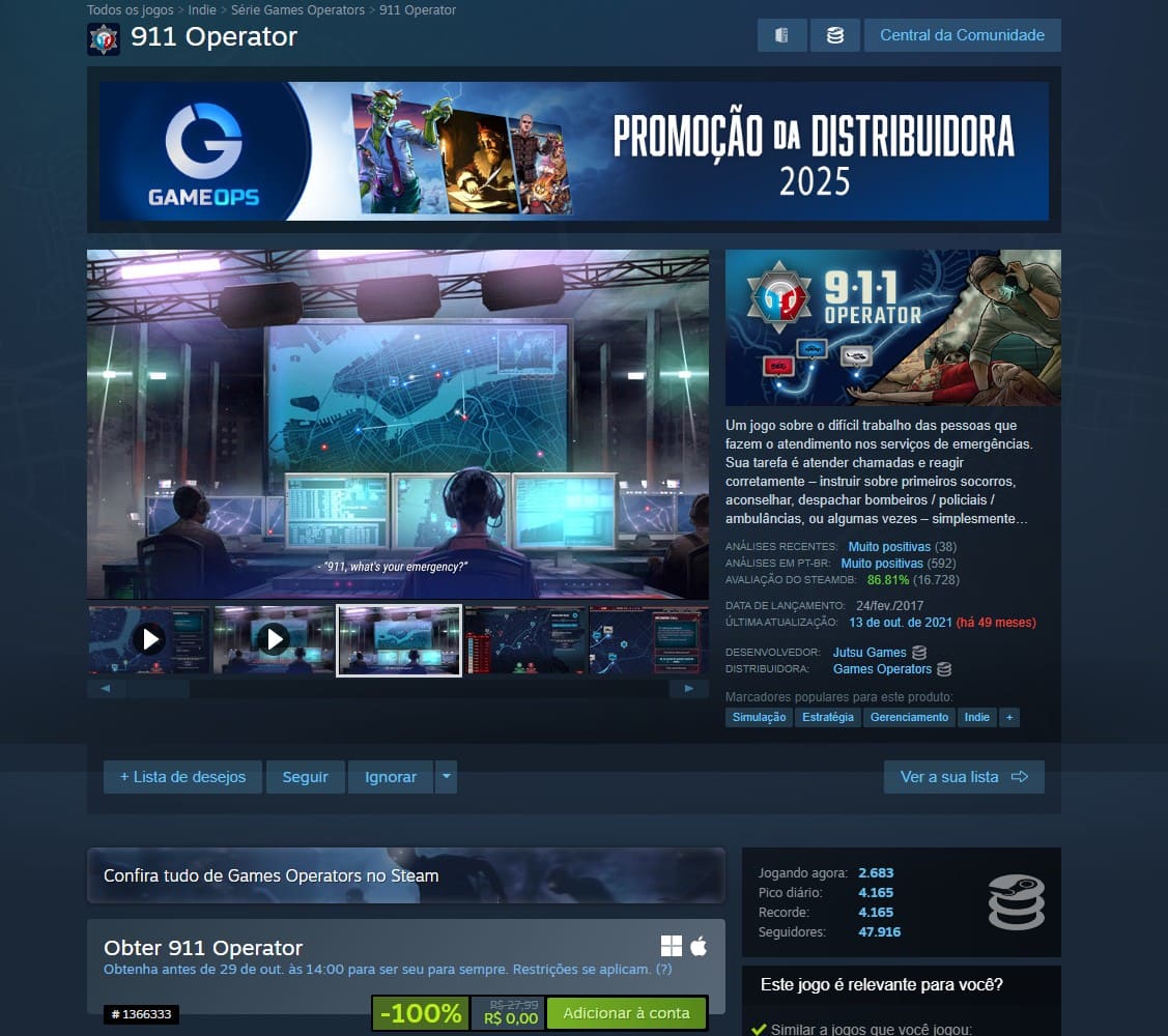 Antes de virar grátis 911 Operator custava R$ 27,99 no Steam, porém você precisa resgatar esse jogo até quarta-feira, dia 29 de outubro, as 2 da tarde para ficar com ele para sempre.