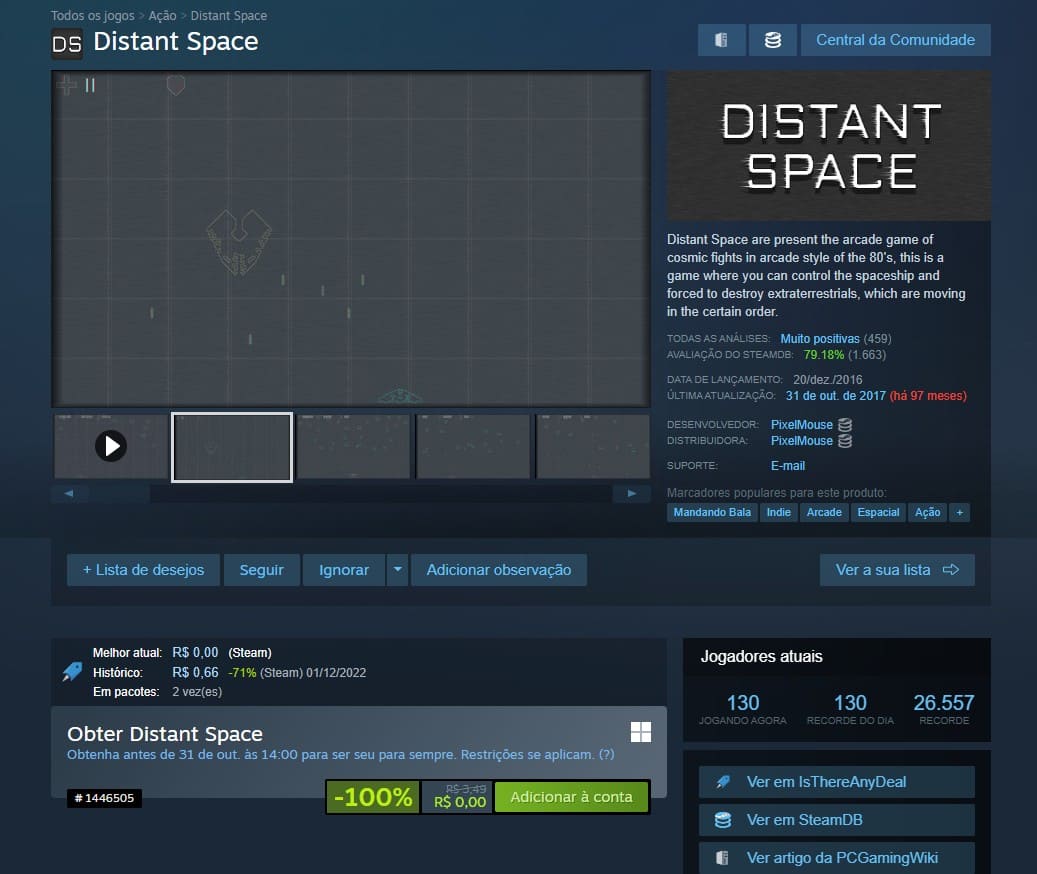 Antes de virar grátis Distant Space custava R$ 3,49 no Steam, porém você precisa resgatar esse jogo até sexta-feira, dia 31 de outubro, as 2 da tarde para ficar com ele para sempre.