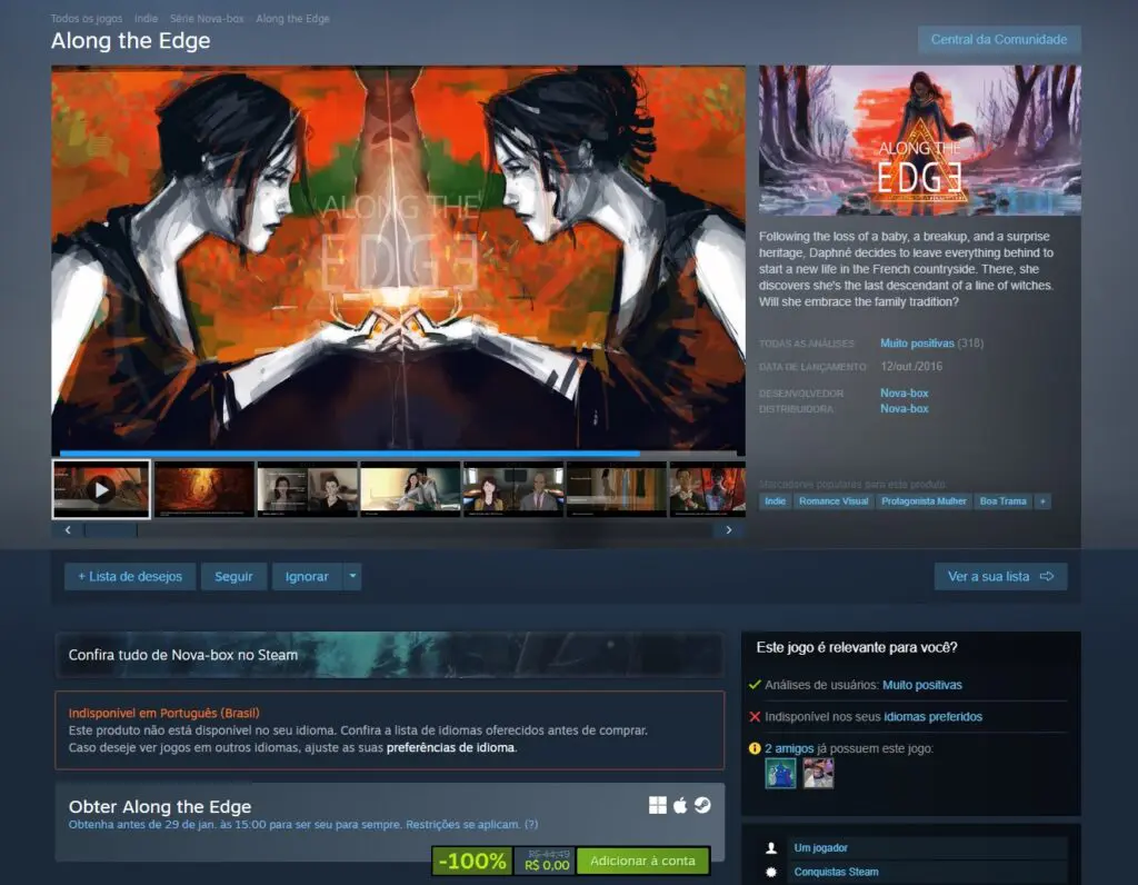 Antes de virar grátis Along the Edge custava R$ 44,49 no Steam, porém, você precisa resgatar esse jogo até 29 de janeiro, as 15h para ficar com ele para sempre.