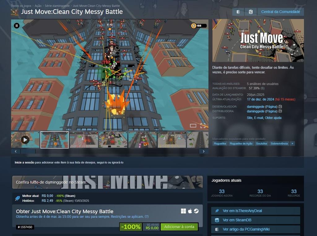 Antes de virar grátis Just Move: Clean City Messy Battle custava R$ 49,99 no Steam, porém, você precisa resgatar esse jogo até 4 de março, as 15hr para ficar com ele para sempre.