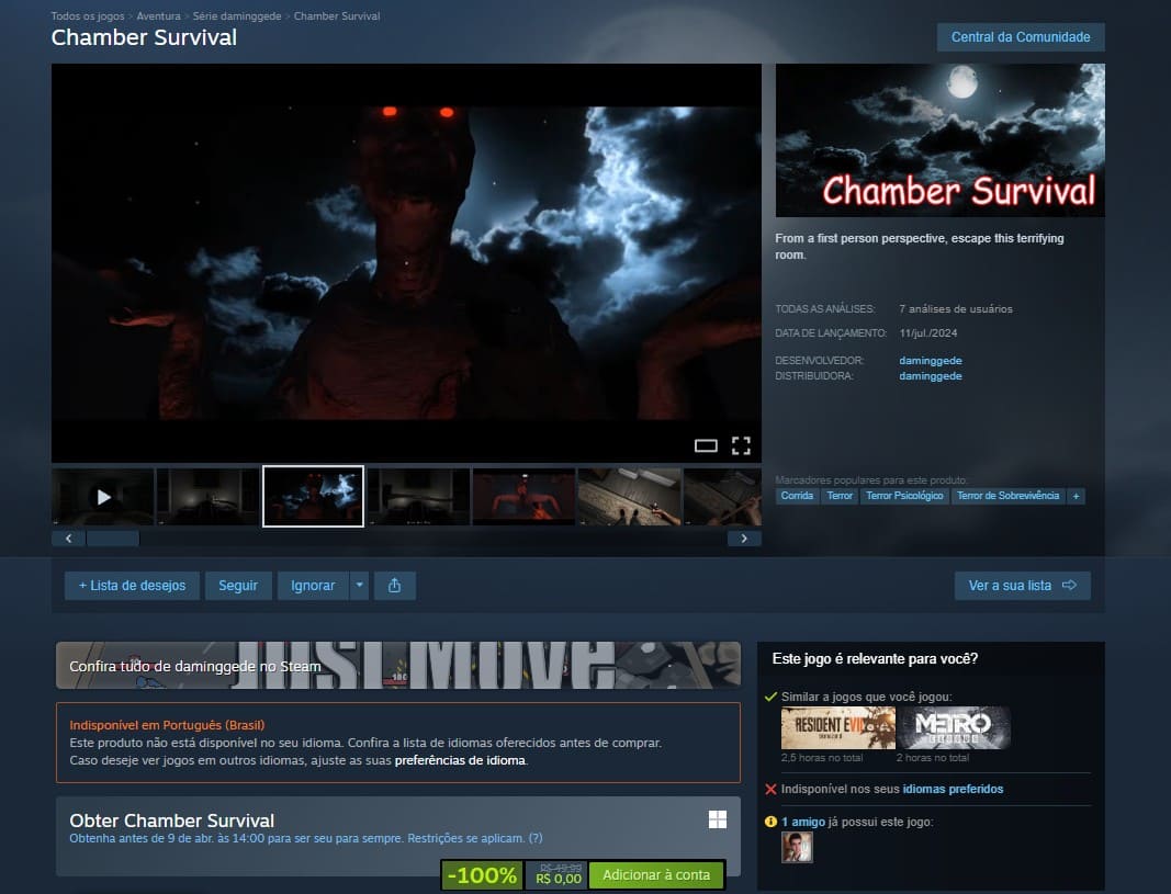 Antes de virar grátis Chamber Survival custava R$ 49,99 no Steam, porém, você precisa resgatar esse jogo até 9 de abril, as 14hr para ficar com ele para sempre.