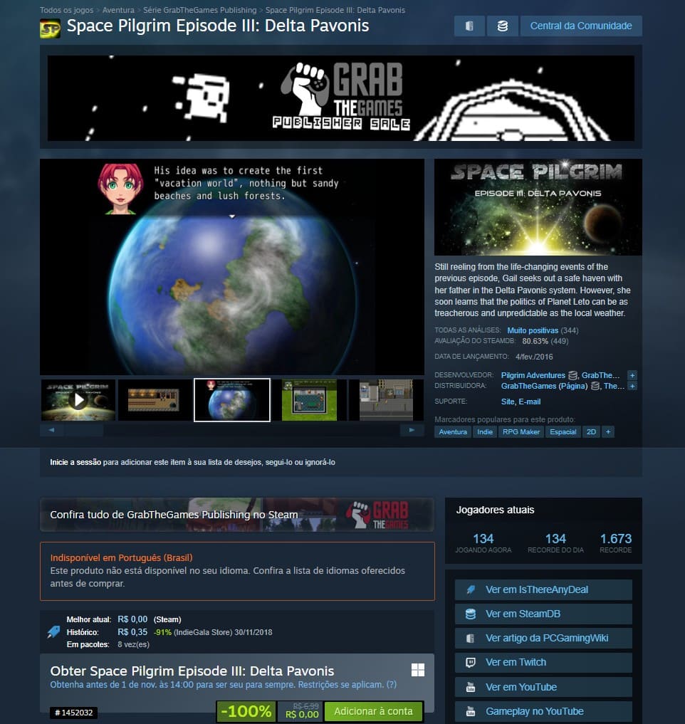 Antes de virar grátis Space Pilgrim Episode III: Delta Pavonis custava R$ 6,99 no Steam, porém você precisa resgatar esse jogo até sábado, dia 1º de novembro, as 2 da tarde para ficar com ele para sempre.