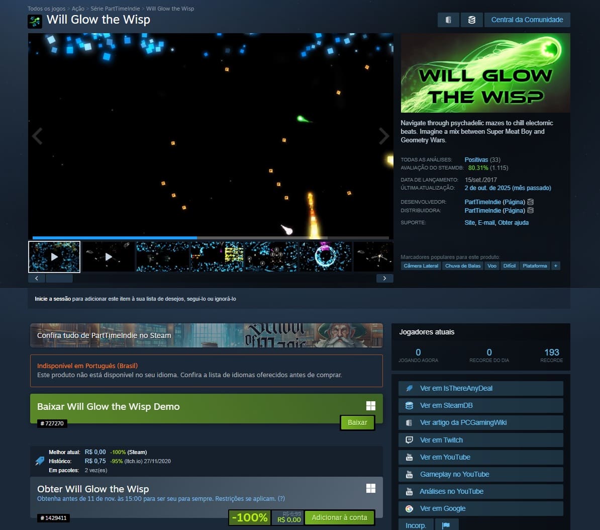 Antes de virar grátis Will Glow the Wisp custava R$ 6,99 no Steam, porém você precisa resgatar esse jogo até 11 de novembro, as 3 da tarde para ficar com ele para sempre.