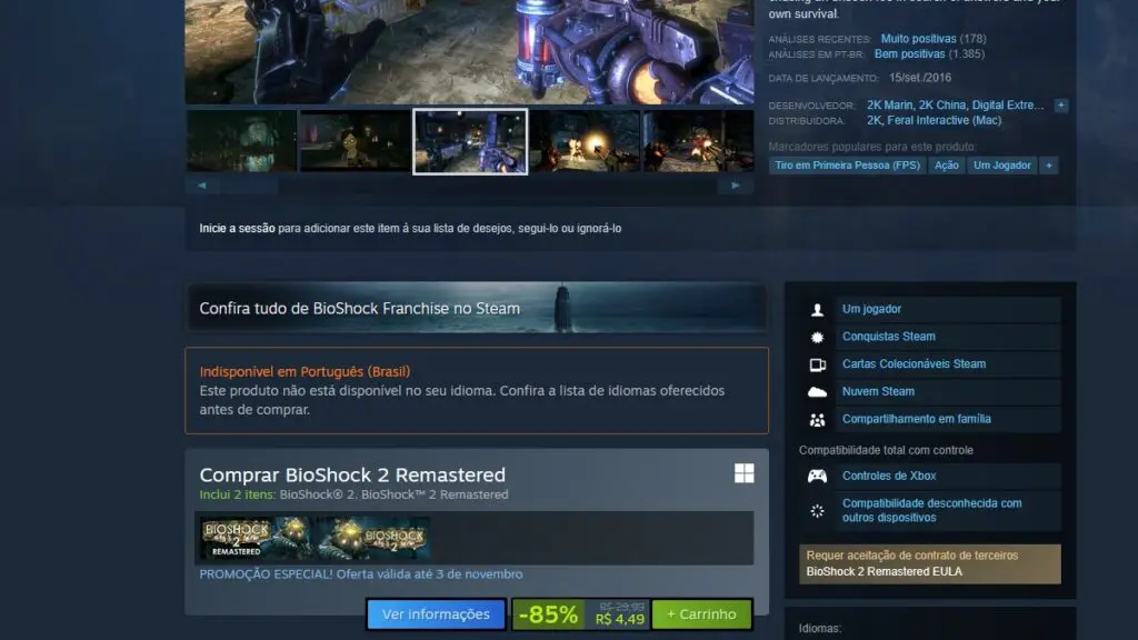 BioShock 2 Remastered está por R$ 4,49 no Steam. Antes do super desconto, BioShock 2 Remastered custava R$ 29,99 no Steam. A promoção vai até o dia 03 de novembro, então é preciso resgatar o game antes desse prazo para garantir o desconto.