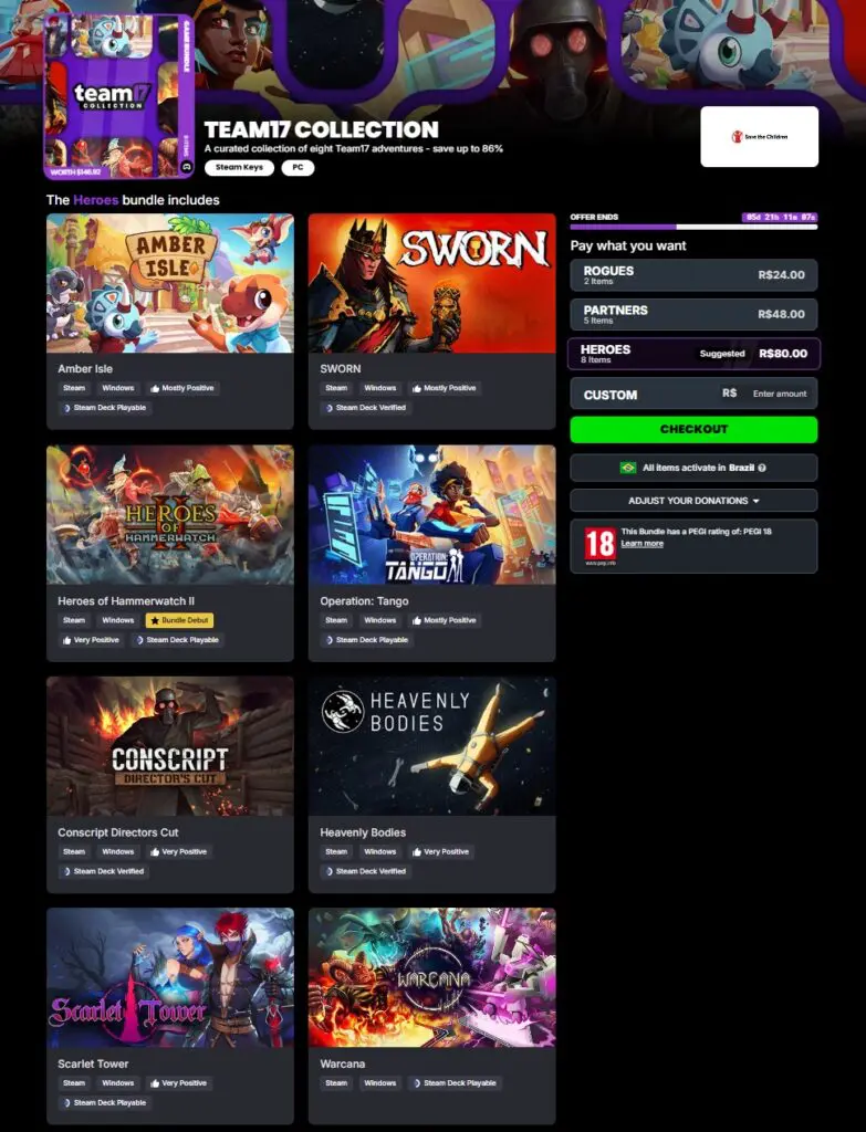 Entre os jogos disponíveis do pacote Team17 Collection, temos títulos como Sworn e mais e se você fosse comprar todos os jogos separados no Steam, gastaria R$ 418,53.