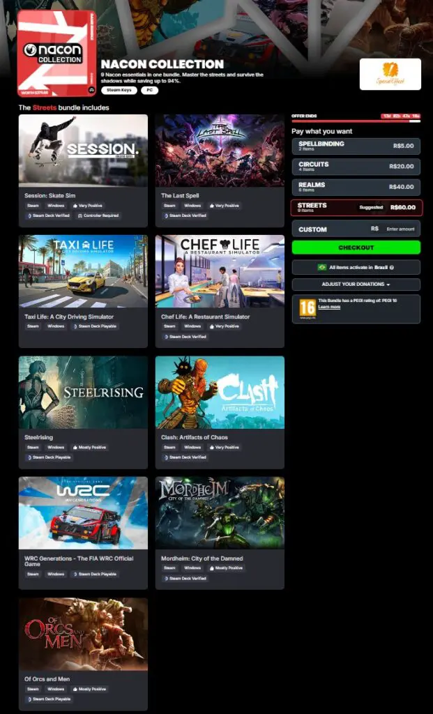 Entre os jogos disponíveis do pacote Nacon Collection, temos títulos como Session: Skate Sim, WRC Generations e mais e se você fosse comprar todos os jogos separados no Steam, gastaria R$ 632,02 ou R$ 115,17 em seus menores preços históricos.