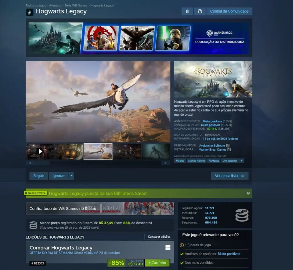 O Steam liberou o menor preço histórico de Hogwarts Legacy no PC, e o game sai agora por apenas R$ 37,49.