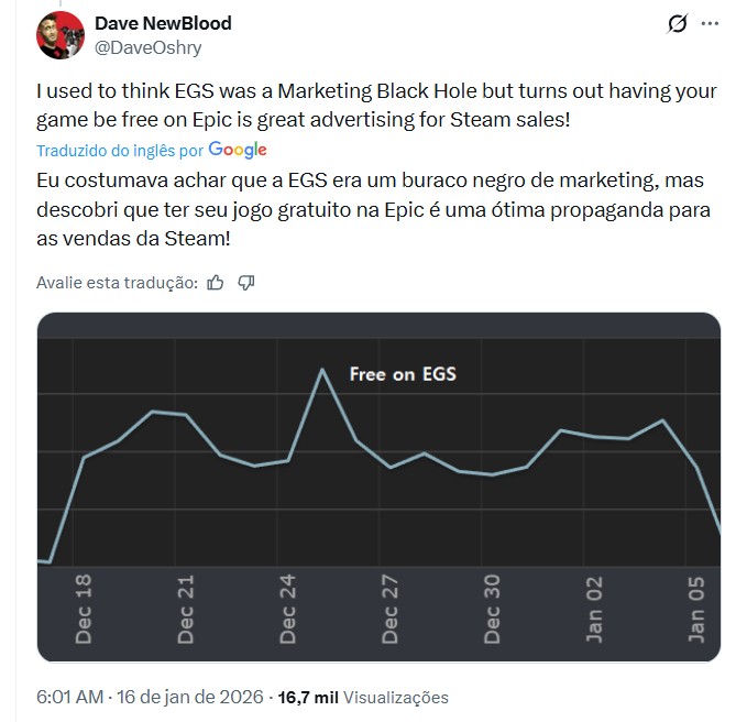 Ele ainda complementou dizendo “Eu costumava achar que a EGS era um buraco negro de marketing, mas descobri que ter seu jogo gratuito na Epic é uma ótima propaganda para as vendas do Steam!“