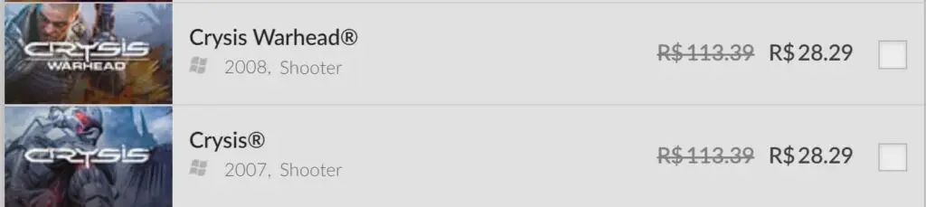 O jogo Mirror’s Edge (2009) também foi outra vitima dessa prática, no qual o jogo também custava R$59 e subiu para R$113,39 na loja; Jogos da franquia clássica de Crysis como Crysis 1 e Crysis Warhead também tiveram os seus preços ajustados para R$113,39 e sim, eles estão mais caros do que as versões Remasterizadas que foram lançadas no ano passado.