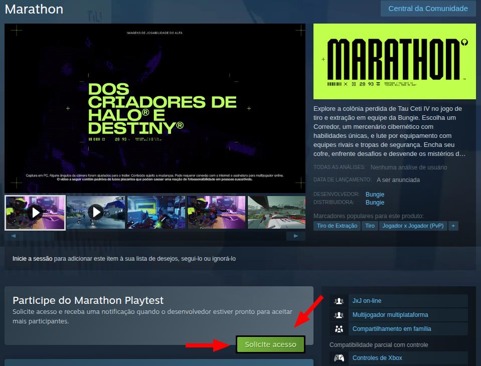 A Bungie abriu as inscrições para o teste técnico fechado do jogo de tiro Marathon no Steam. Para participar, basta clicar no botão “Solicite acesso”. Os sortudos que forem selecionados receberão um e-mail mais próximo do início dos testes. Os consoles PlayStation e Xbox também participarão do playtest.