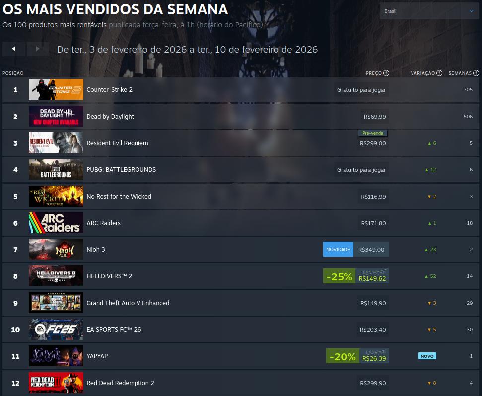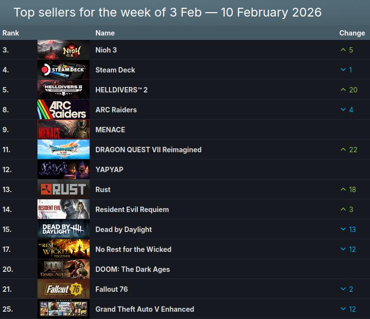 O grande destaque do ranking dos mais vendidos da semana no Steam foi Nioh 3, que assumiu a liderança. O jogo foi lançado em 6 de fevereiro e recebeu altas classificações de jornalistas, enquanto estabeleceu um recorde de jogadores online da Koei Tecmo no Steam.
