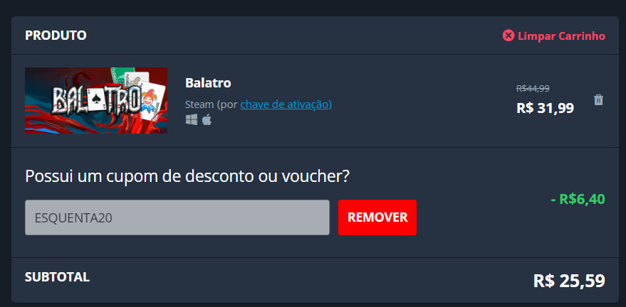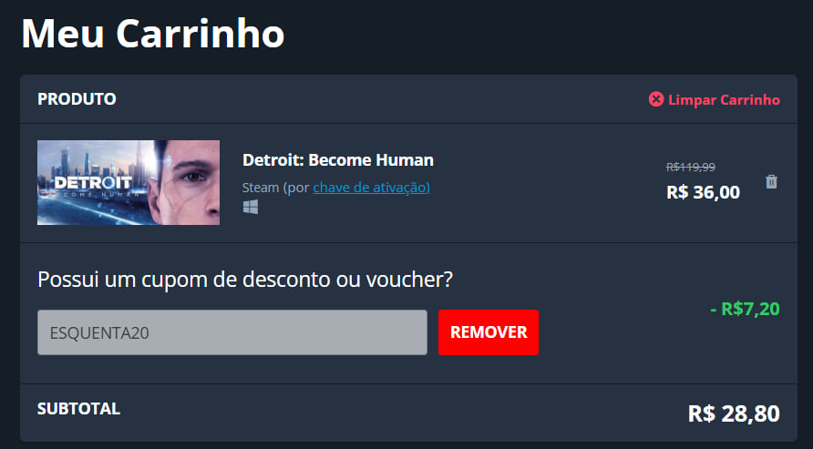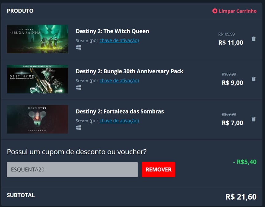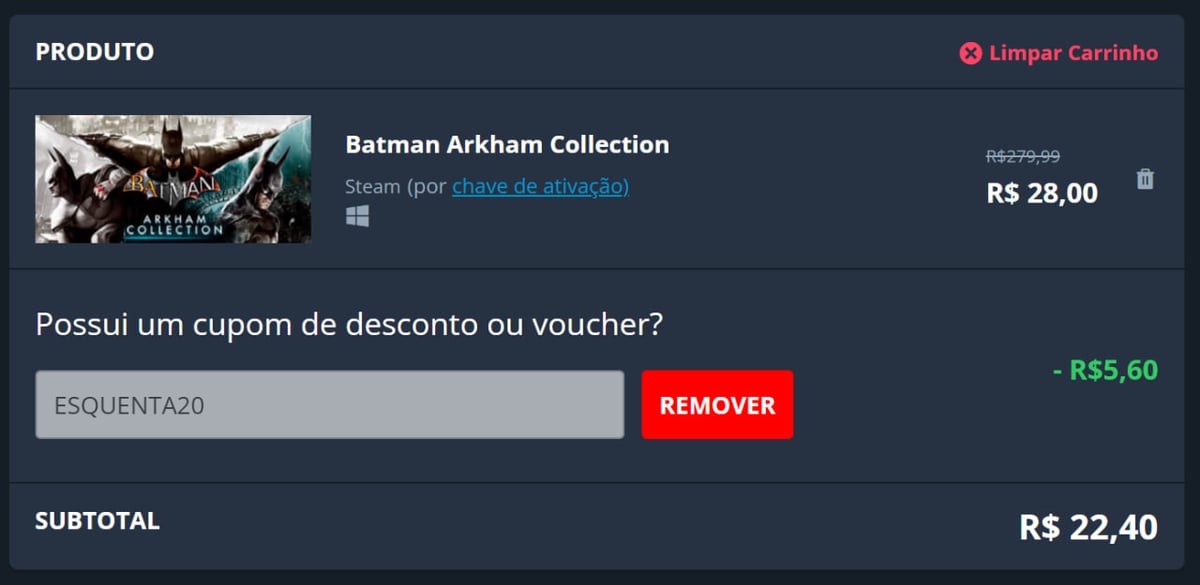 A ativação desses jogos é em sua conta Steam. As ofertas ficarão ativas até a próxima semana, porém, o cupom de desconto ESQUENTA20 pode acabar a qualquer momento.