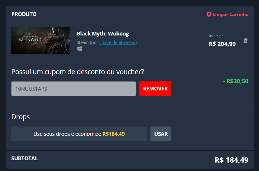 - Black Myth: Wukong de R$ 229,99 por R$ 204,99