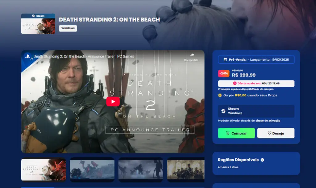 Previsto para ser lançado em 19 de março por R$ 399,90 para PC, Death Stranding 2 recebeu uma grande promoção na loja brasileira Nuuvem, saindo agora por R$ 299,99.