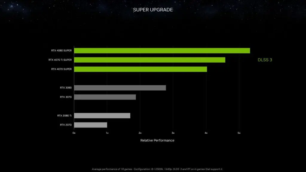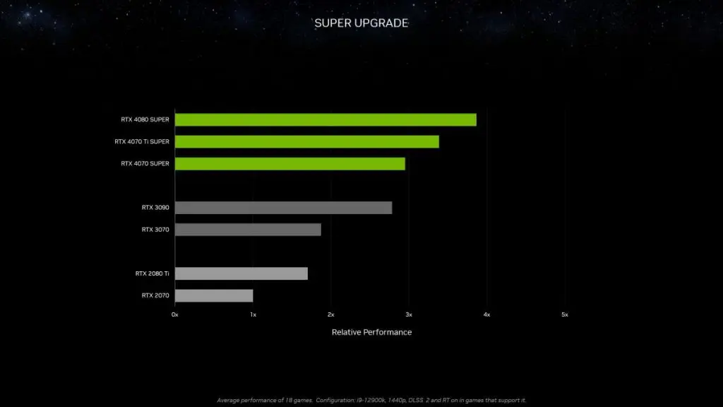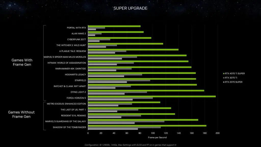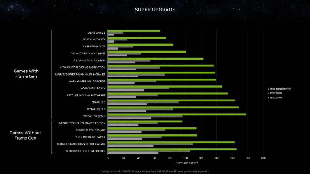 Para jogadores que usam a geração anterior GeForce RTX 3070 ou RTX 2070, esta é uma super atualização. A empresa promete mais de 100 FPS em jogos modernos e exigentes ao usar resolução de 1440p.