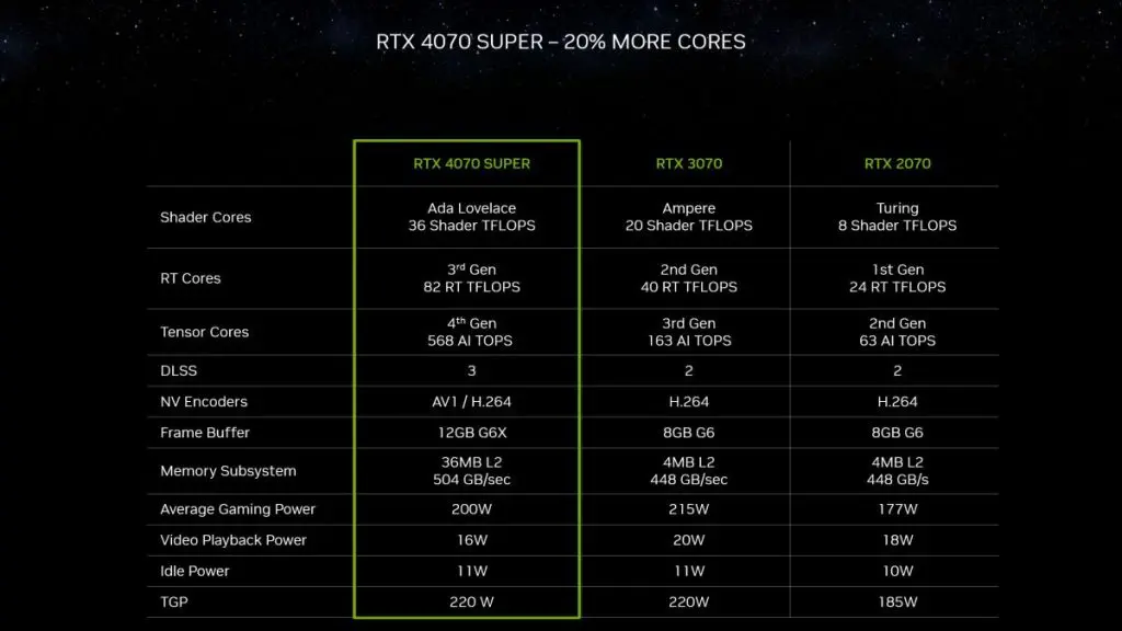 A memória permanece a mesma – 12 GB GDDR6X, 36 MB de cache L2 e largura de banda de 504 GB/s. A NVIDIA diz que a RTX 4070 Super é mais rápida que a RTX 3090.
