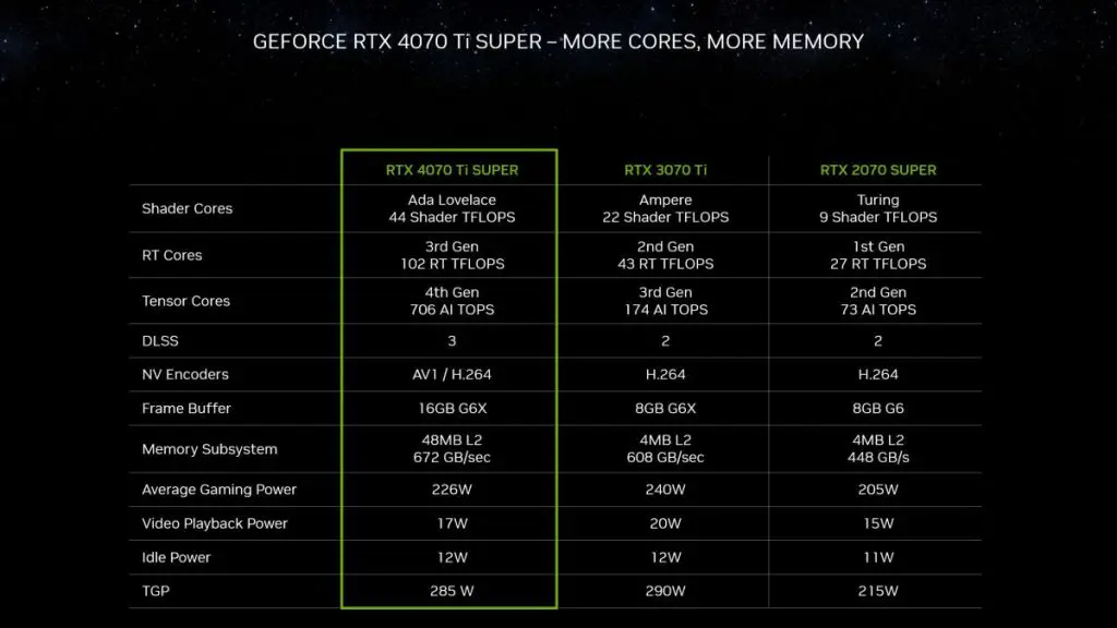 A RTX 4070 Ti Super foi aprimorada para 66 unidades de computação (contra 60 da RTX 4070 Ti) e 8.448 núcleos CUDA (contra 7680).