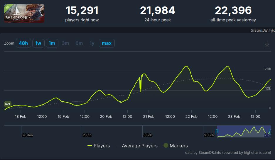 A demo do jogo de sobrevivência pirata Windrose, da Windrose Crew, ultrapassou 22.000 jogadores simultâneos e 1 milhão de adições à lista de desejos do Steam apenas seis dias após o lançamento.
