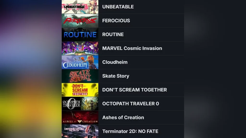 O primeiro lugar é ocupado por UNBEATABLE, um jogo de ritmo inspirado em anime, ambientado em um mundo onde a música é considerada crime. Em segundo lugar está Ferocious, um jogo de tiro e sobrevivência com dinossauros.