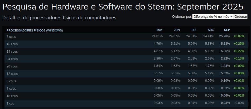 As CPUs de 6 núcleos ainda são as mais populares, mas caíram abaixo de 30% de participação pela primeira vez. Da mesma forma, CPUs com maior número de núcleos também estão ganhando força, com as CPUs de 16 núcleos sendo uma das que mais ganharam participação em setembro.