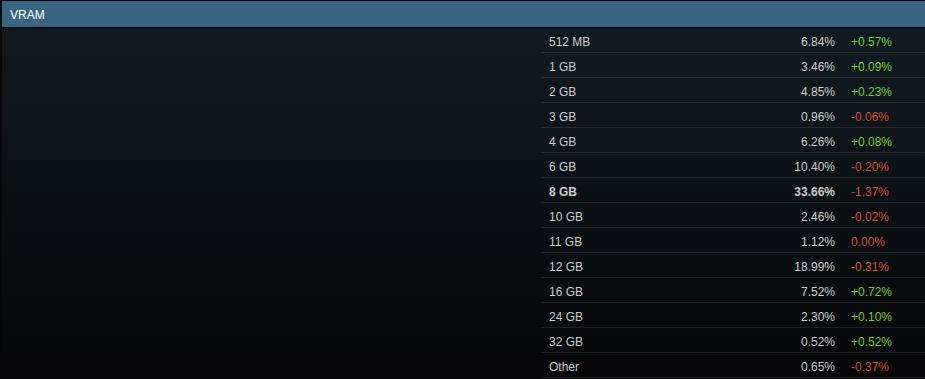 GPUs com 8 GB de VRAM estão perdendo popularidade lentamente e, embora ainda seja a configuração de VRAM mais popular em placas de vídeo, teve uma queda expressiva de 1,37% em relação a agosto.