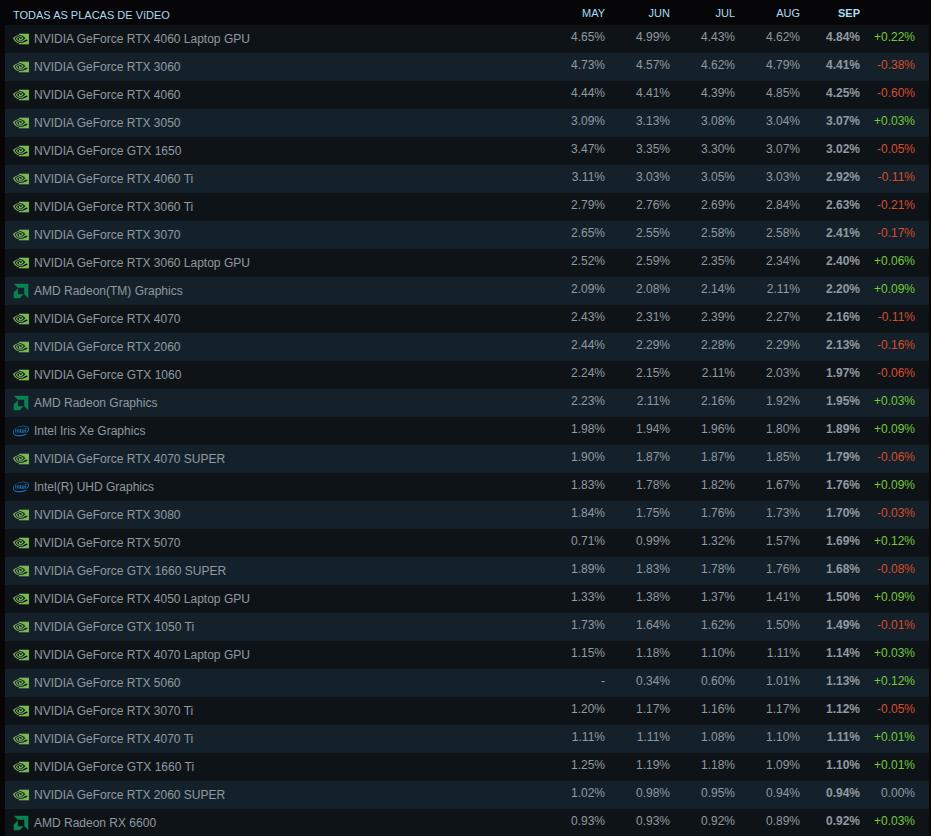 Esta é a maior variação na participação de GPUs de acordo com o Steam, mas logo depois disso, temos várias placas da série RTX 50 que também aumentaram consideravelmente sua participação. A maioria delas são as placas das séries GeForce RTX 5070 e 5060, com a RTX 5070 sendo a placa da série 50 mais popular, com 1,69% de participação total.