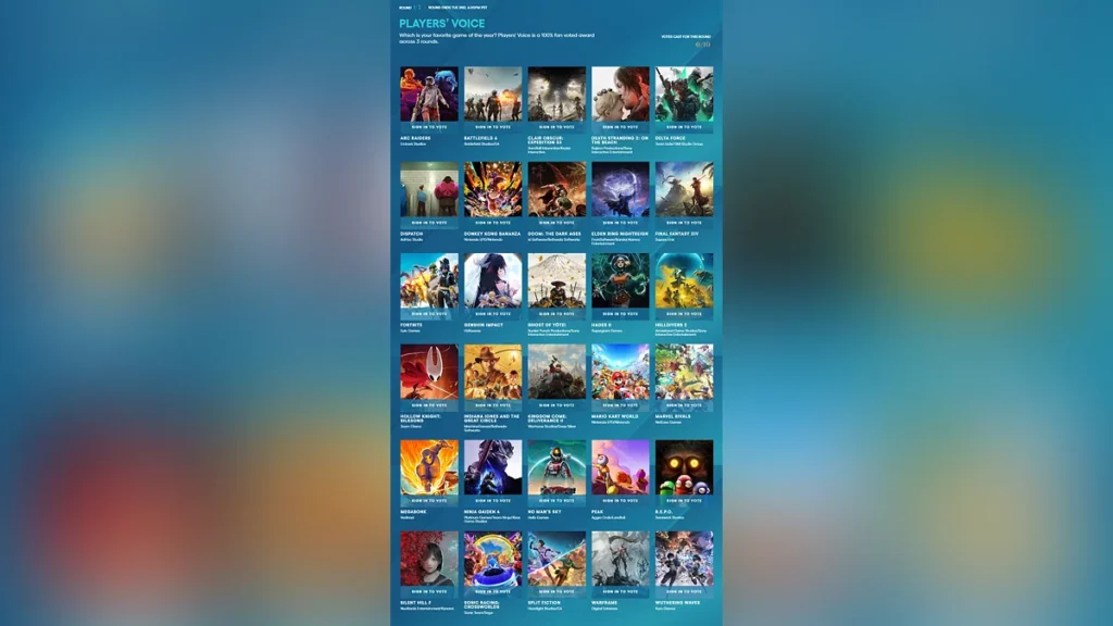 Os organizadores do The Game Awards 2025 lançaram a votação para a categoria Player’s Voice (Voz do Jogador), que determinará o melhor jogo do ano segundo a opinião dos jogadores. Na primeira rodada, que já começou, os jogadores precisam escolher 10 jogos entre 30 concorrentes.