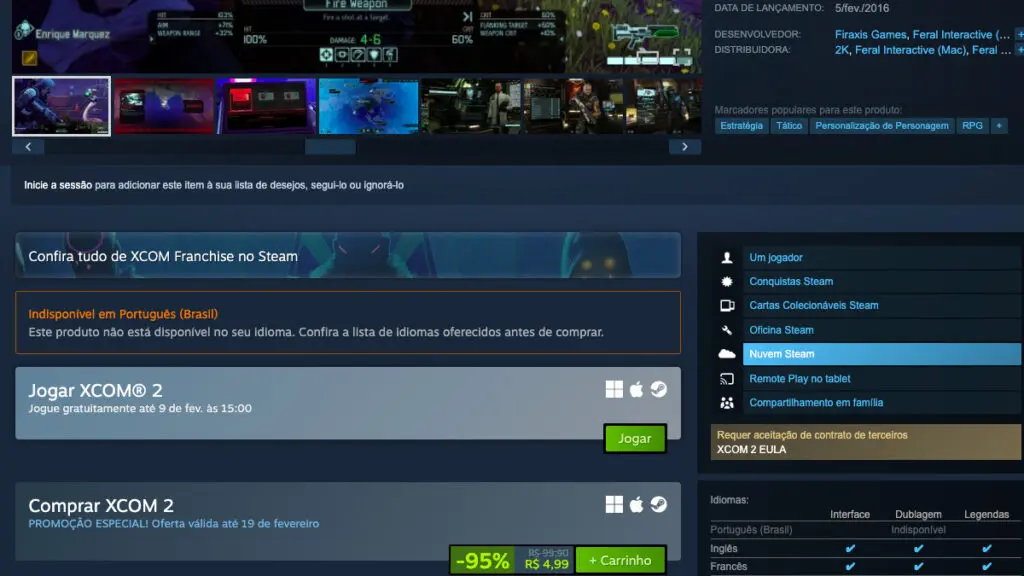 XCOM 2 está por R$ 4,99 no Steam. Antes do super desconto, XCOM 2 estava por R$ 99,90 no Steam. A promoção vai até o dia 19 de fevereiro, então é preciso resgatar o game antes desse prazo para garantir o desconto.