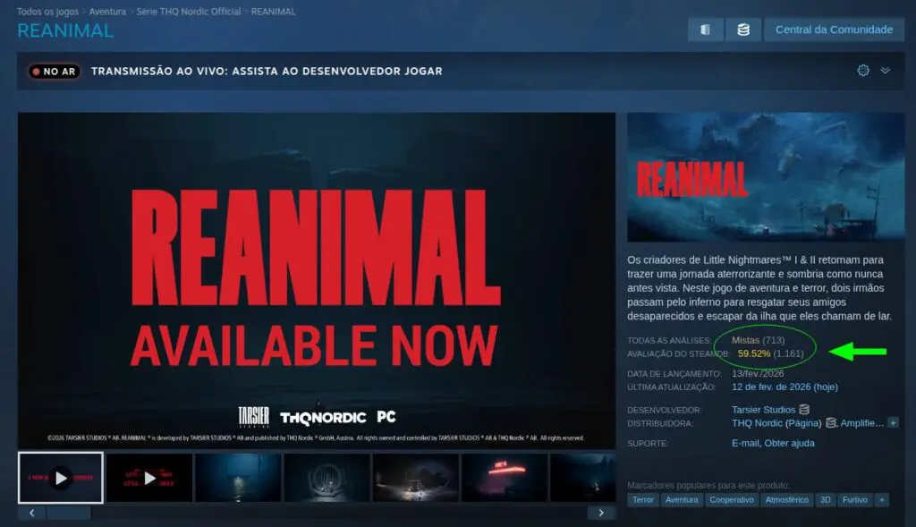 Hoje, 13/02/2026, aconteceu o lançamento do jogo de aventura e terror REANIMAL, mais de 700 análises já apareceram no Steam. No momento da redação desta notícia, o jogo possui uma classificação de 67% de análises positivas.