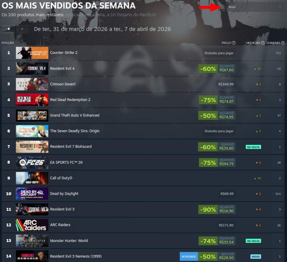 Resident Evil 4 está na última posição do pódio, provavelmente impulsionado por seu menor preço histórico na loja da Valve (R$ 67,50), enquanto o top cinco é completado pelos novos jogos Gray Zone Warfare e ARC Raiders, que subiram uma posição cada.