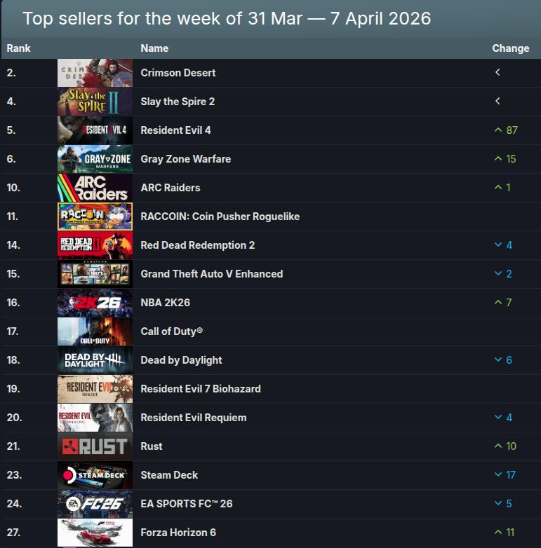 A Valve anunciou os jogos mais lucrativos do Steam na semana de 31 de março a 7 de abril. O primeiro e segundo lugares continuam os mesmos da semana passada com Crimson Desert permanecendo na liderança do ranking e Slay the Spire 2 vindo logo na sequência, permanecendo na segunda posição.