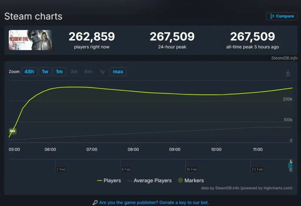 Até o momento, Resident Evil Requiem já ultrapassou a marca de 267 mil jogadores simultâneos na maior plataforma de jogos para PC, e está com 90% de análises positivas.
