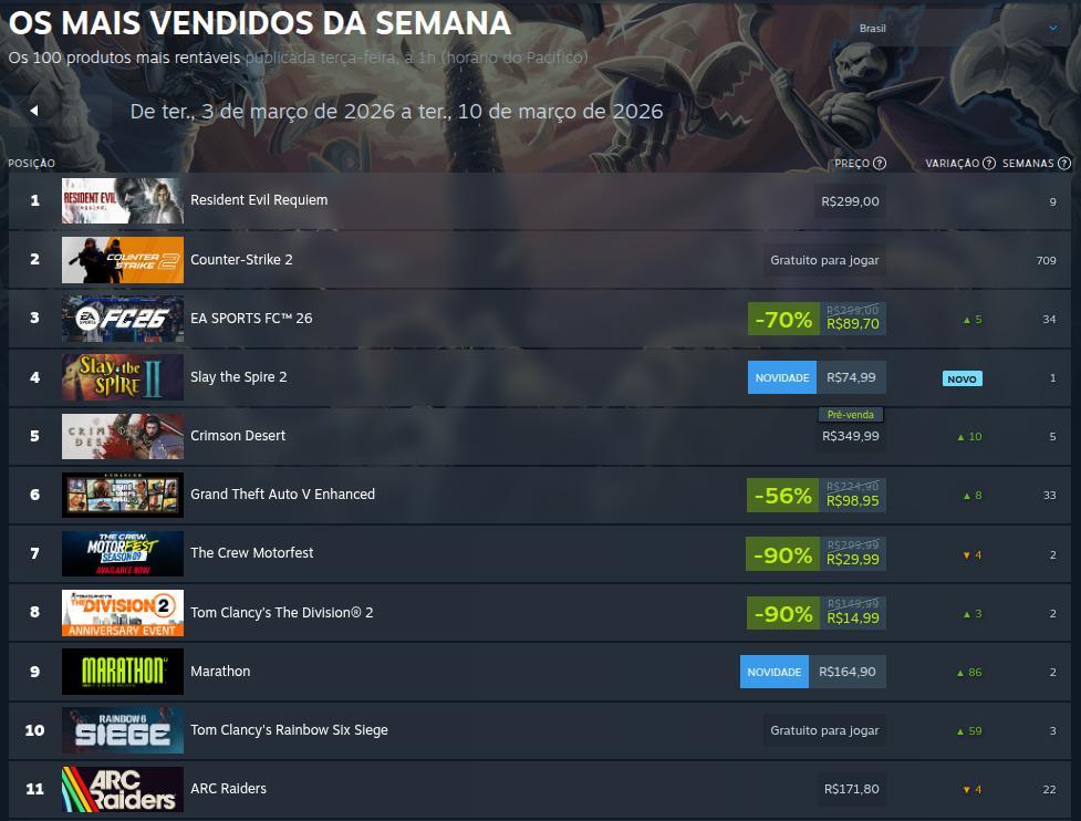 No Brasil, Resident Evil Requiem continua liderando o ranking dos mais rentáveis da semana, superando, inclusive, o poderoso Counter-Strike 2. Na sequência, em segundo lugar, vemos EA Sports FC 26. E para fechar o pódio, Slay the Spire 2 aparece em terceiro lugar.