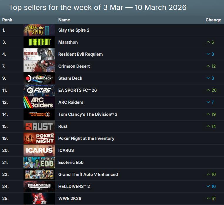 Esta semana, Slay the Spire 2 conquistou com folga o primeiro lugar nas paradas de vendas, tornando-se o lançamento mais vendido. Outro jogo novo, Marathon, da Bungie, também alcançou o pódio e estreou em segundo lugar, mostrando um ótimo começo.